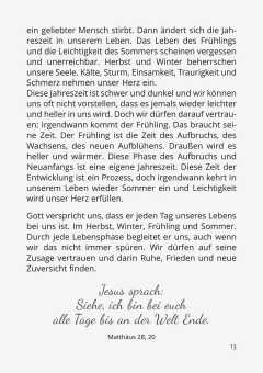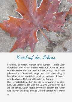 Menschen nehmen in dieser Situation oft nur wenig Hilfe von anderen in Anspruch. Sie ziehen sich lieber zurück. Dieses Heft möchte ein Begleiter sein für ihre Trauerreise. Die Texte schenken Trost, ohne platt und plakativ zu wirken, und wollen Hoffnung auf Leben über den Tod hinaus schenken.